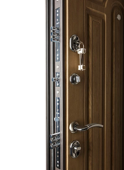 Установлены: цилиндровый замок "STADT", сувальдный замок "STADT", ночная задвижка, броненакладка, эксцентрик, ручки и глазок.