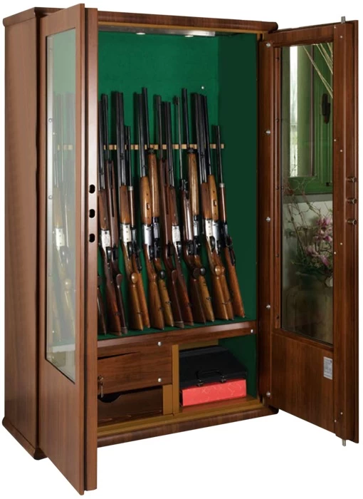 Внутренний интерьер сейфа Dragone 1931245 BTL, отделанный зелёным паласом, исключительно функционален и подходит для комфортабельного размещения оружия всех видов, от длинноствольного до ручного, а также для охотничьей амуниции, патронов и при желании – для хранения наличных денег и ценностей: здесь имеется трейзер (отделение для патронов, ручного оружия и т.д., которое запирается собственным ключом) и удобные ложементы на двадцать стволов. В дверце и стенке данной модели имеются бронестёкла для безопасной демонстрации оружия.